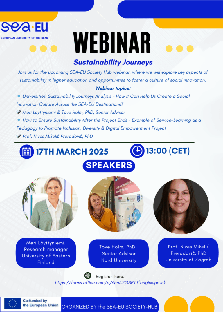 We are delighted to invite you to the 4th SEA-EU SOCIETY HUB Webinar on the topic “Sustainability Journeys”, where we will explore key aspects of sustainability in higher education and opportunities to foster a culture of social innovation.