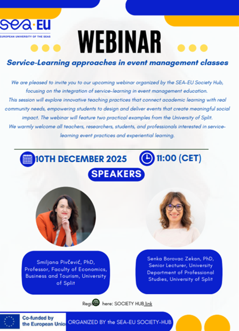 We are pleased to invite you to our upcoming webinar organized by the SEA-EU Society Hub, focusing on the integration of service-learning in event management education. This session will explore innovative teaching practices that connect academic learning with real community needs, empowering students to design and deliver events that create meaningful social impact.