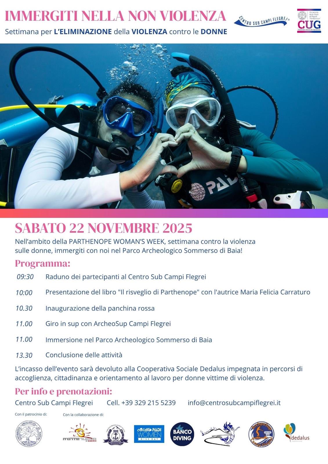 A particularly special fifth event of the Parthenope Women’s Week was held in Pozzuoli, bringing together the evocative world of the sea and powerful stories of inspiration. Among the protagonists were the “Sirene nel Blu”, including Cristina Canoro and fellow divers from across Campania, alongside Mariafelicia Carraturo, apnea champion and a role model for many. On the occasion, Carraturo also presented the new edition of her book The Awakening of Partenope.