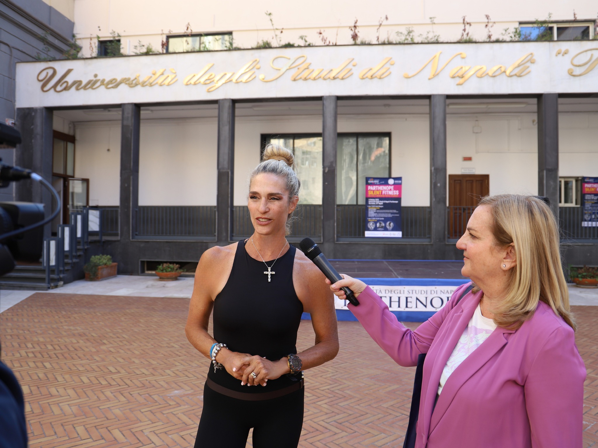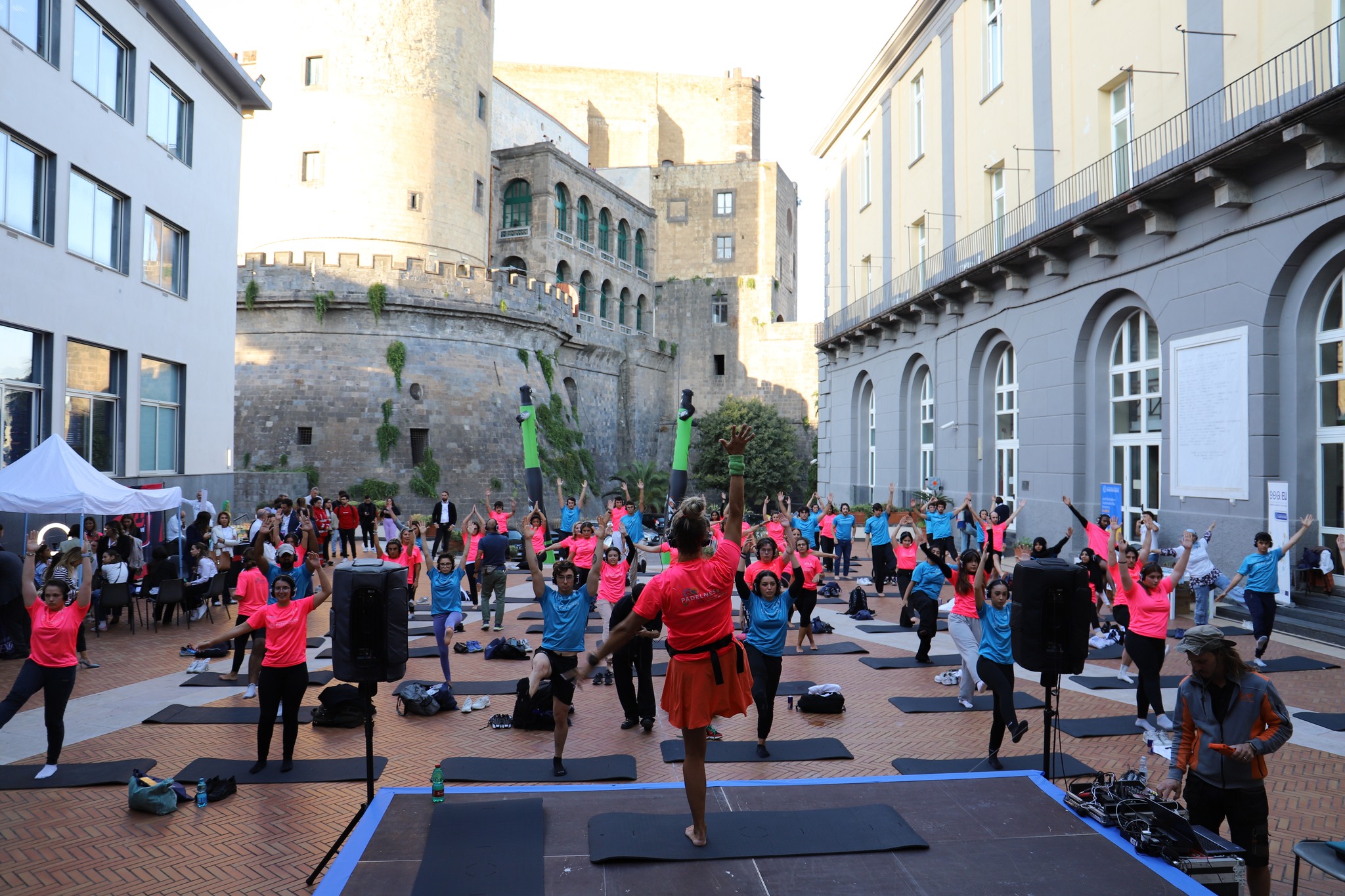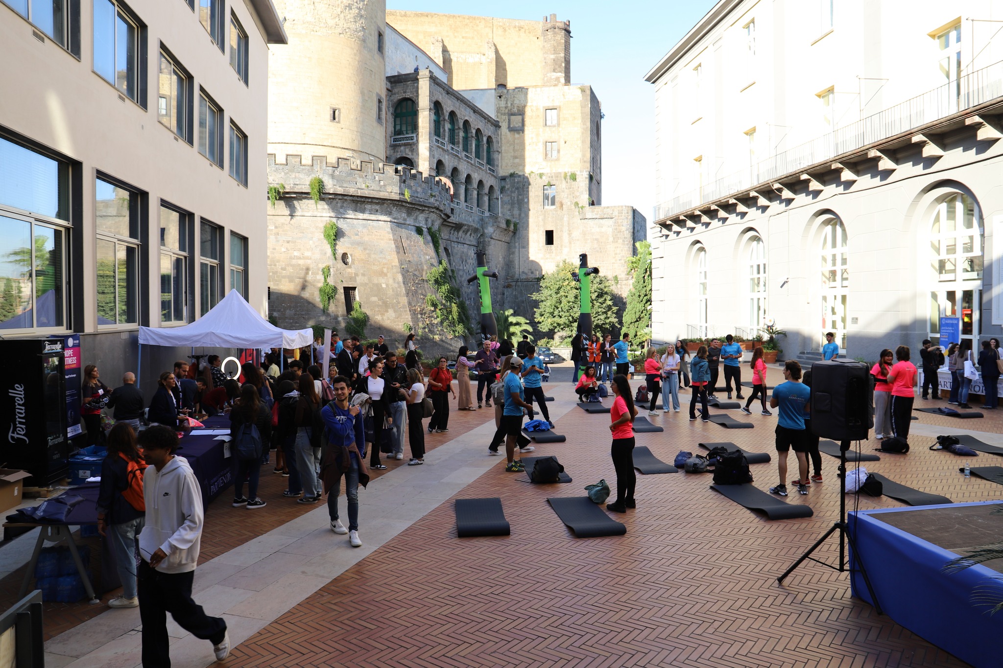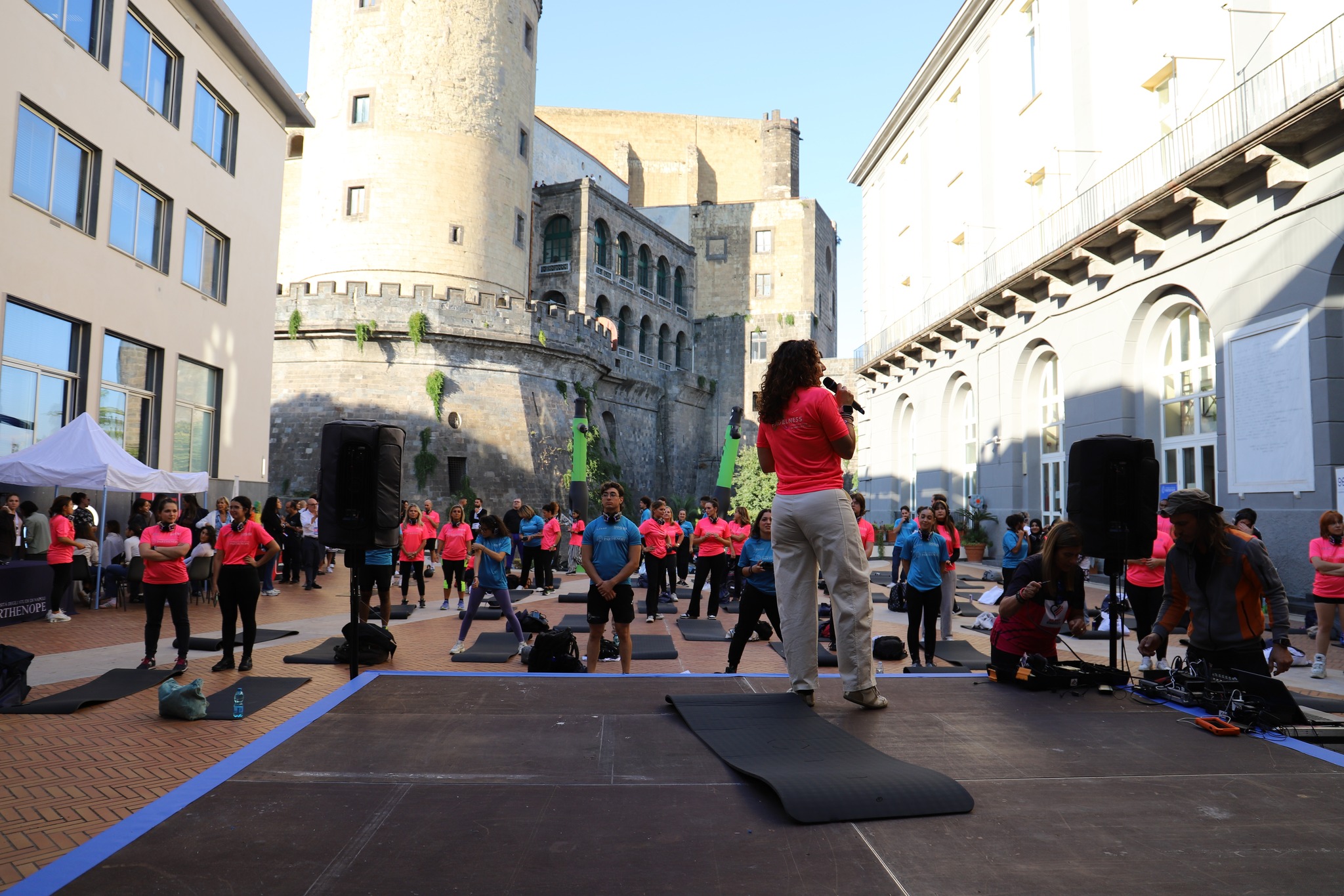The courtyard of Parthenope University’s Central Administration was transformed into an open-air gym, welcoming around 150 students who took part in a dynamic masterclass led by Jill Cooper, Marianna Perruno (CEO of Padelness) and Gil Lopes – internationally recognised figures and leading professionals in the fitness sector.