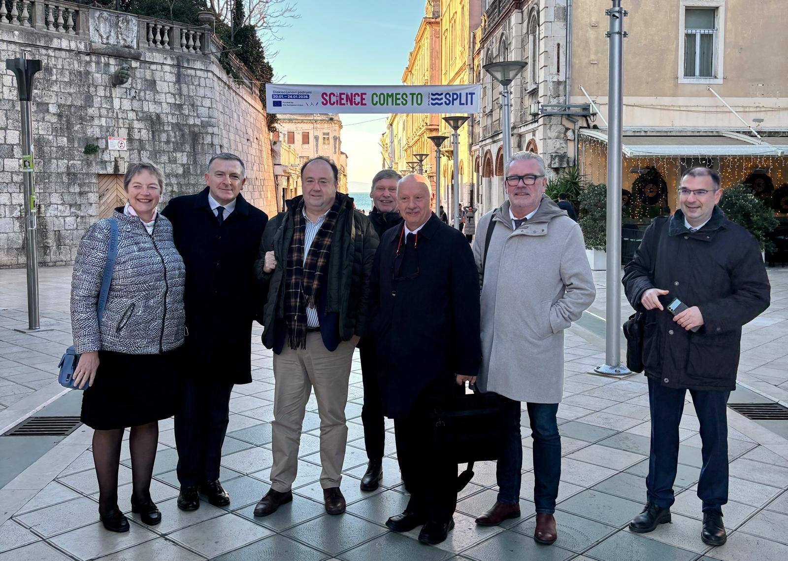 The meeting, held in Split on 19–20 January, continued with “Science Comes to Town” Opening Ceremony at Hrvatski dom Split, highlighting the importance of bringing science, research and universities closer to society. This public-facing event set the tone for two days of strategic discussion focused on consolidation, future growth and long-term sustainability. Science Comes to Town is a European initiative designed to bring science closer to citizens by transforming cities into open, accessible spaces for research, innovation and public engagement. Through a strong collaboration between universities, local authorities and regional stakeholders, the programme promotes year-long, city-wide scientific activities that connect academia with society, foster curiosity and participation, and reinforce the social responsibility of research and innovation. Within this framework, the joint UNITES project, supported by the SEA-EU Alliance, positions Kiel, Brest and Split as interconnected hubs of science in 2026, building on the legacy of the European City of Science and aligning with the goals of the European Research Area and the Pact for Research and Innovation.