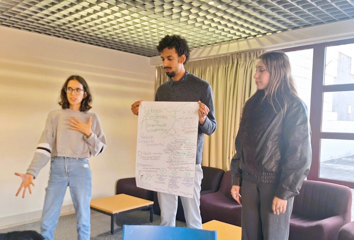 The project Systemic Change in Academic Food Practices, developed by Sebastião Gonzaga, Rita Oliveira and Tatiana Gomes, proposes awareness-raising actions on the ecological footprint of food by identifying CO₂ emissions and the resources used in meal preparation. The project Evolving the Campus, by Cecília Isabel, Vítor Machado, Inês Duarte and Quelly Filipe, focuses on reforesting the Gambelas Campus with cork oaks and holm oaks, promoting carbon sequestration and long-term fire prevention.
