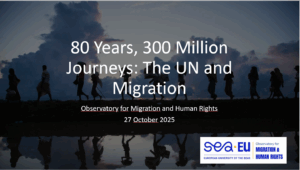 On October 27, the Observatory of Migration and Human Rights launched its online seminars, starting in collaboration with the University of Cádiz. The opening session featured insightful contributions from Ángeles Jiménez, Lorena Calvo, and Marian Bellido, accompanied by other distinguished experts in Human Rights and Migration from the universities of the SEA-EU Alliance.